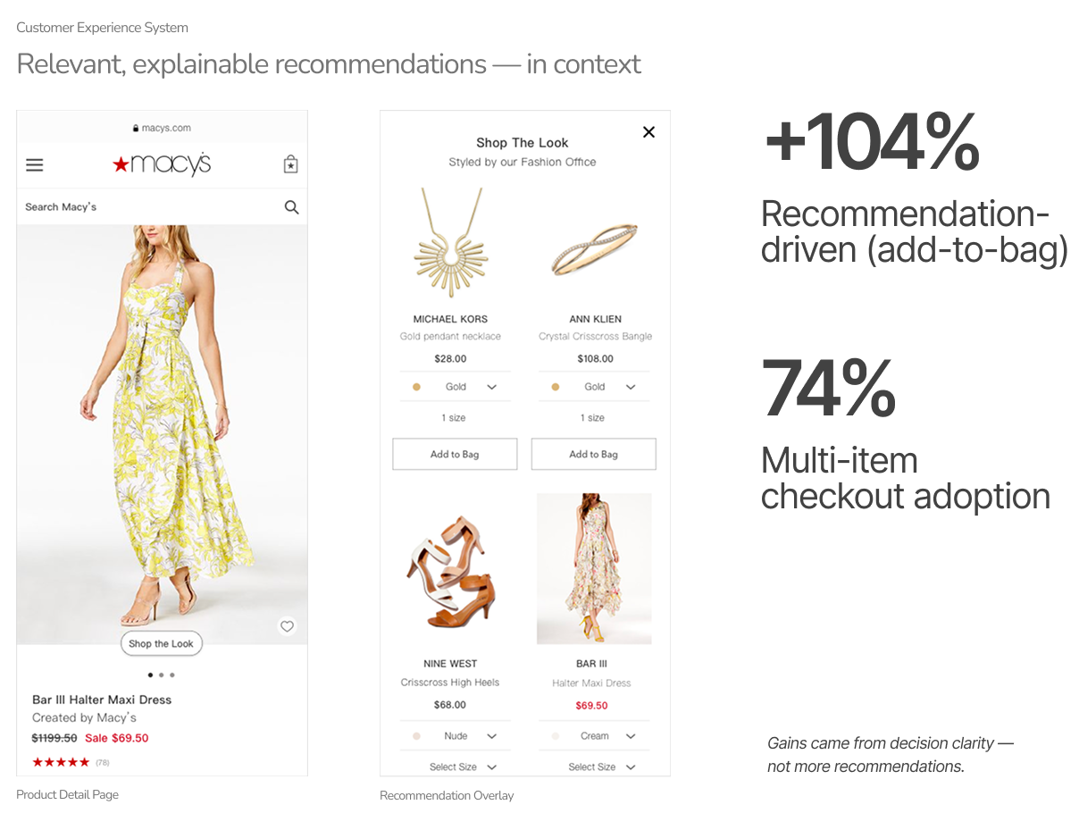 By centralizing recommendation logic and clarifying decision rules, we increased engagement while reducing friction between personalization and merchandising constraints.