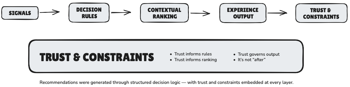 Rather than designing around surfaces or placements, we structured the recommendation system around a shared decision layer — separating signals, business rules, ranking logic, and trust constraints.